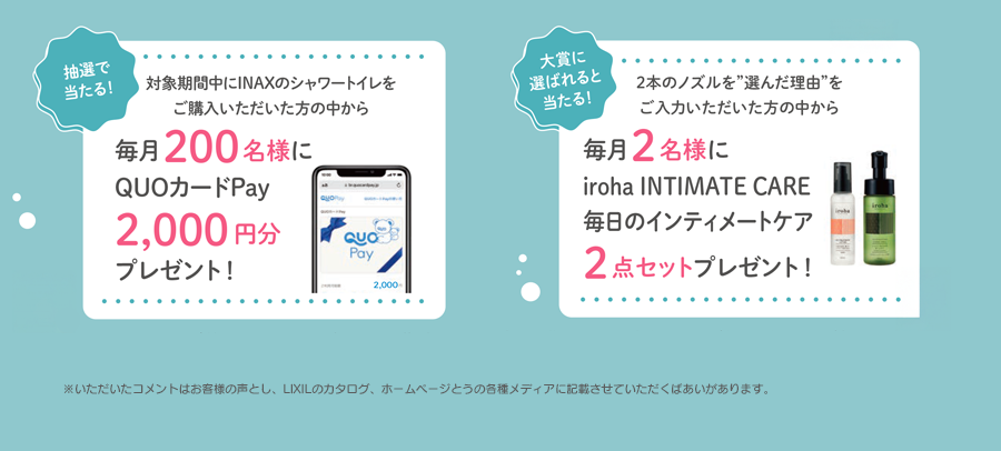 対象期間中にご購入いただいた方に中からQUOカードPayが抽選で当たる!さらに、選んだ理由をご入力いただいた方の中から毎日のインティメートケア2点セットプレゼントキャンペーンです