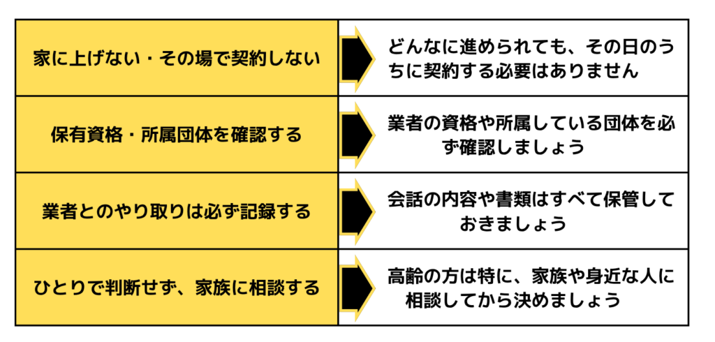 不審な業者が訪問してきた場合は、一人で対応せず、まずはご家族や信頼できる専門家にご相談ください。