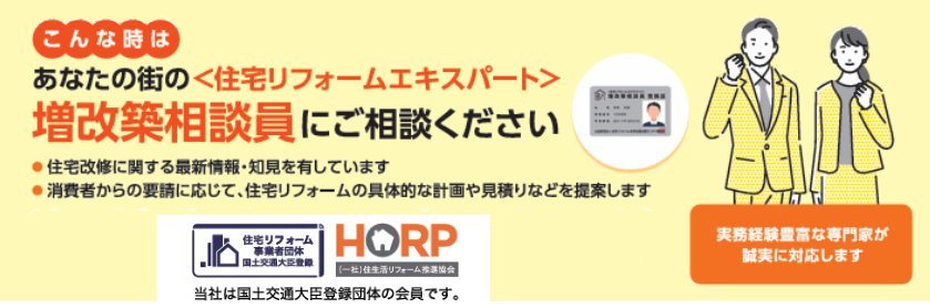 「リフォームをどう進めたらいいかわからない」「費用の見積りや融資について知りたい」「耐震・省エネ・防犯リフォームについて相談したい」という方は、**住宅リフォームエキスパート(増改築相談員)**にご相談ください。